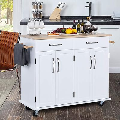 2 shelves and a drawer provide multiple ways to keep your kitchen organized and all of your cooking essentials close at hand. Kitchen carts can have open or closed shelves and may feature towel racks, hooks and drawers. Choose from contactless same day delivery, drive up and more. Is made of a fine hardwood with an attractive oil finish and white lacquered base. White kitchen island with spice rack and towel holder.
