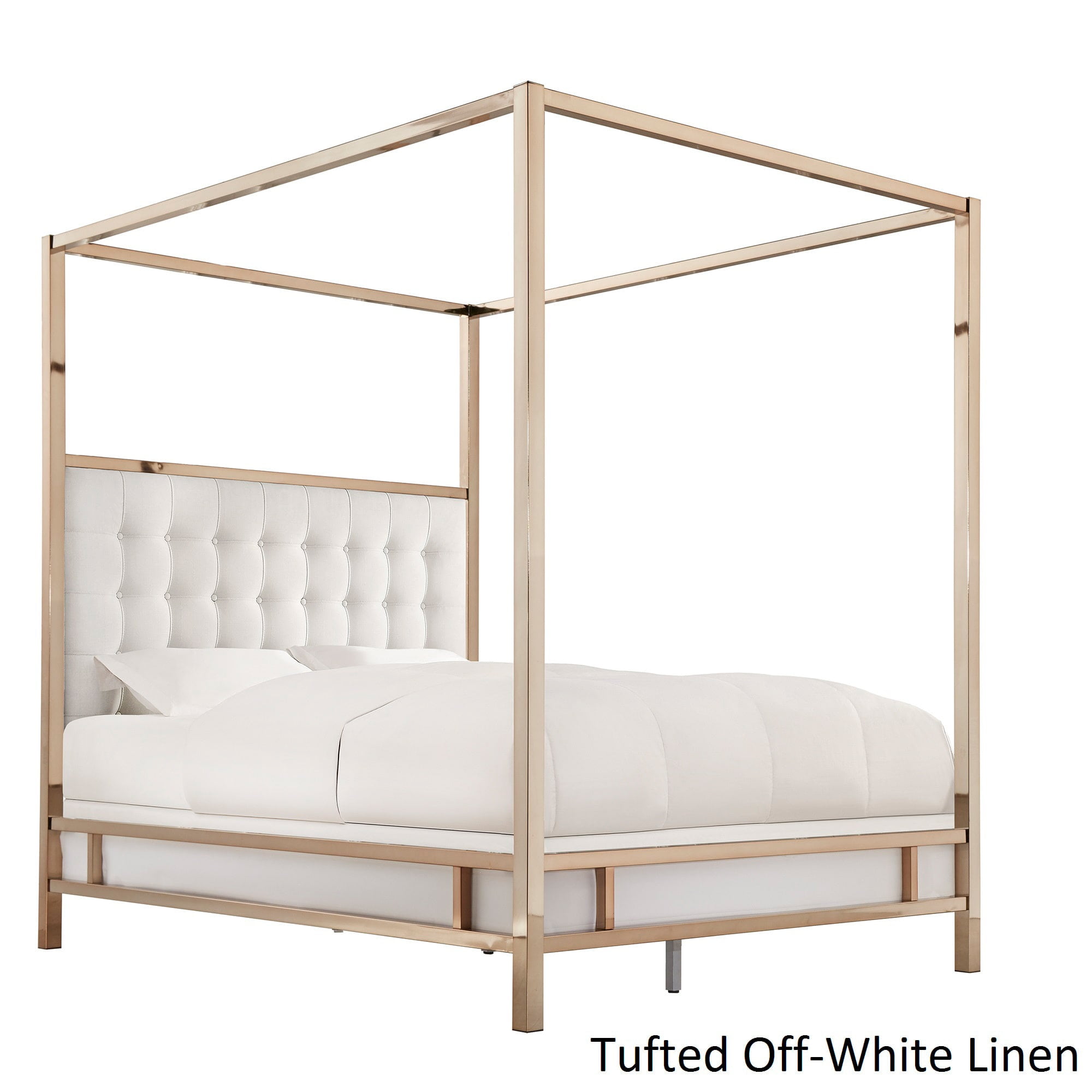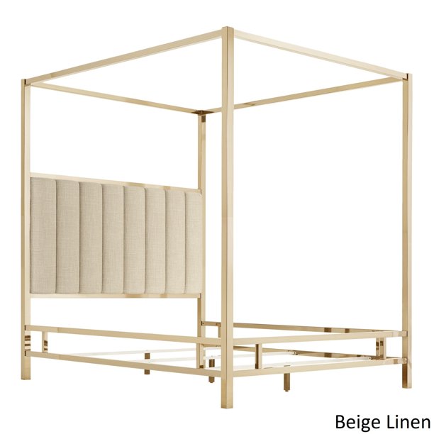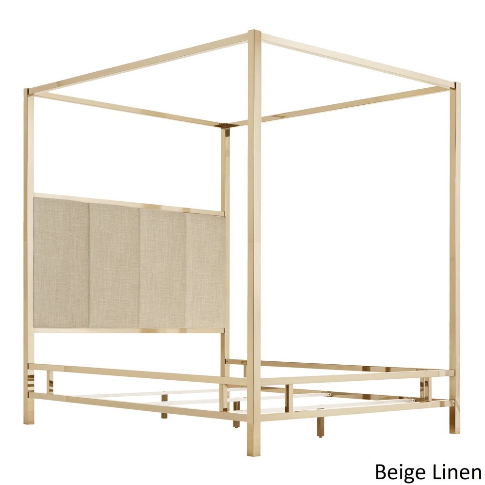 Champagne gold finish metal canopy bed with upholstered headboard insert upholstery options include white linen, dark grey linen, or black bonded leather mattress and box spring are required for use, but not included full bed measures 58.5 w x 81 d x 83 h queen bed measures.